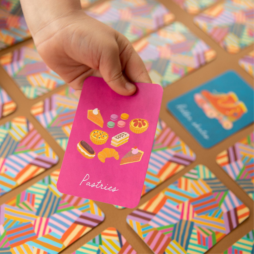 Everyday Wonders the memory card game is a limited-edition set of 24 iconic playing cards, based on fun, hand-drawn illustrations from the book. We love the nostalgia of this classic game of memory. There are 12 different designs to create the set of 24 cards, plus an instruction card. Each card is laminated, with rounded corners for durability.